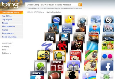 Legújabb bejelentés szerint az MS új keresője, a Bing képkereső motorja már rendelkezik külön iPhone alkalmazások galériájával. Ha az alkalmazás ikonja fölé viszed az egeret, akkor megjelenik a neve, rövid leírás a fejlesztővel, árral, kategóriával, rangsorban elfoglalt pozícióval és az utolsó frissítés dátumával. Azonban iTunes-os linket már nem tettek bele 🙂