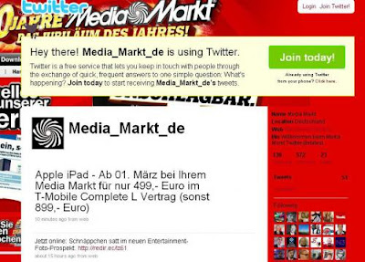A német MediaMarkt twitteren elszólta magát, mert csipogása szerint a március 1-től értékesítésre kerülő iPad T-Mobile-os szerződéssel 499 euróba, szerződés nélkül 899 euróba fog kerülni. Később törölték a tweetet.