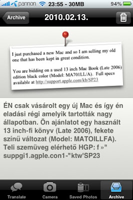 Netet böngészve találtam egy igen hasznos kis alkalmazást, mely utazóknak nyújthat nagy segítséget. A Babelshot nevű program a fényképen lévő szöveget ismeri fel és fordítja le más nyelvre. Az alkalmazás 32 nyelven fordít, nagy előnye, hogy magyarul is tud. Nem kell mást tenni, mint lefényképezni a fordítani kívánt szöveget és a program lefordítja más nyelvre. Segítséget nyújt étlap, felhasználói kézikönyv, újság, szórólap fordításánál. Ha esetleg képről mégsem ismeri fel a szöveget, kézzel is be lehet vinni a fordítani kívánt részt. Azért a magyar fordítás hagy némi kívánnivalót maga után, de használható. Fordítás az Archive könyvtárba el is menthető, így később visszakereshető.