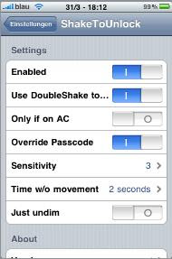 Ha a telefon készenléti állapotban van, elég megrázni és rögtön aktívvá válik, kinyitja a képernyőt. Az alkalmazás beépülhet az SBSettingsbe is, számos beállítási lehetősége van: