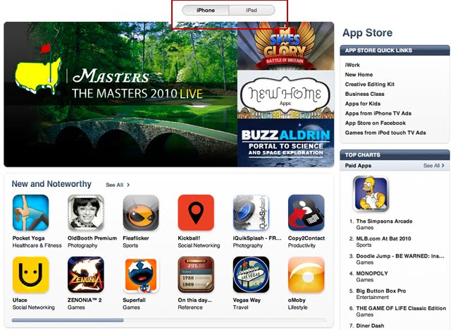 Apple végre meglépte amit már egy hete meg kellett volna tennie. Külön Store-ban vásárolhatóak meg az iPad-es alkalmazások. iTunes-ban az oldal tetején van két gomb: iPhone, iPad. Így mindenki kiválaszthatja melyik boltban akar böngészni, véletlenül sem vásárol meg olyan alkalmazást, amely készülékével nem kompatibilis.