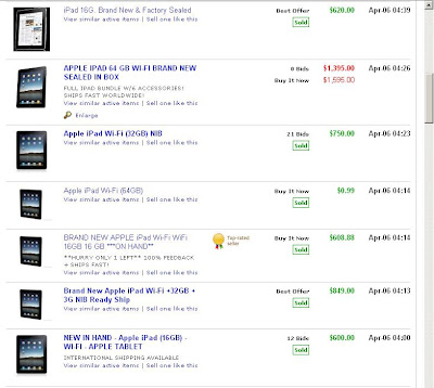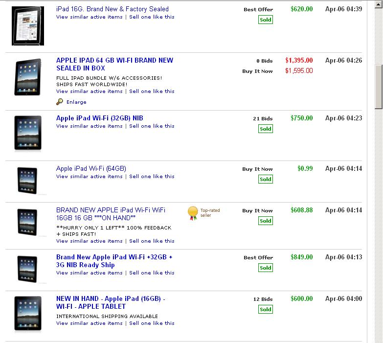 Alighogy elkezdték hivatalosan árulni az iPad-et, a készülék megjelent az eBay-en is. Ebben nincs semmi meglepő, mert az iPhone esetében is ez történt. Azonban az eladók csak jó pénzért hajlandóak megválni a készüléktől. Míg a 16 GB-os modell gyárilag 499 dollár (+ÁFA), addig eBay-en 600-620 dollárért kapható. A 32 GB-os készülék Apple-nél 600 dollárba kerül, míg az aukciós oldalon 700-750 dollárért cserél gazdát. A 64 GB-os 700 dollár helyett 850-900 dollárba kerül. Még 3G-s modellt is eladtak, pedig még meg sem jelent… Ha valaki hivatalosan akarja behozni, akkor még hozzájön a szállítás, vám és áfa is. Lehet, hogy annyira nem kell sietni, bár nem hiszem, hogy itthon annyira olcsó lesz.