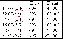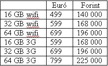 Úgy látszik Cupertinoban is más multik árazását használták (pl. Sony), 1 dollár = 1 euró. Így Franciaországban és Olaszországban is a 16 GB-os wifis modell 499 euróba, a 32 GB-os 599 euróba, míg a 64 GB-os 699 euróba fog kerülni. A 3G-s készüléknél egy kicsit visszavettek az arányból, mert 599, 699 vagy 799 eurót kell fizetni a boldog tulajdonosnak. Spanyolország ennél árnyalatnyival olcsóbb, de lehet hogy félreütés. Forintra átszámított kalkulált árakat lásd a táblázatban (1 euró = 280 forint). Attól tartok itthon ez még drágább lesz 🙁 Érdemes lesz az eBay-en körülnézni.