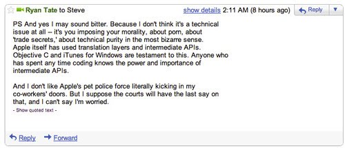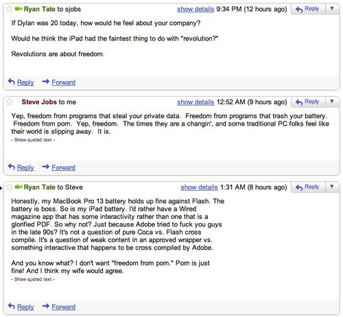 A Gawker Mediának már volt egy összezördülése az Apple-lel (ők vették meg az elvesztett/ellopott iPhone prototípust), de úgy látszik a dolgozók nem tanultak belőle. Az egyik munkatársuk az iPad reklámján kapta fel a vizet, miért hirdetik forradalminak? Azon nyomban írt Jobsnak egy levelet, amire persze az válaszolt. Szó szót követett, főleg a Gawker-es hapsi részéről eldurvult a levelezés. Jobs végig megőrizte higgadtságát, nehogy már egy ilyen kis mitugrász kihozza a sodrából 🙂 A péntek éjszakai levelezés itt olvasható.