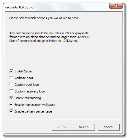 A Cydiát mindenképpen válaszd ki. Verbose boot csak a fejlesztőknek és geekeknek hasznos. Továbbá választhatsz háttérképet, multitaskingot és numerikus akksi-szint kijelzést is. A háttérkép eléggé belassítja a rendszert, nem javallott a választása.
