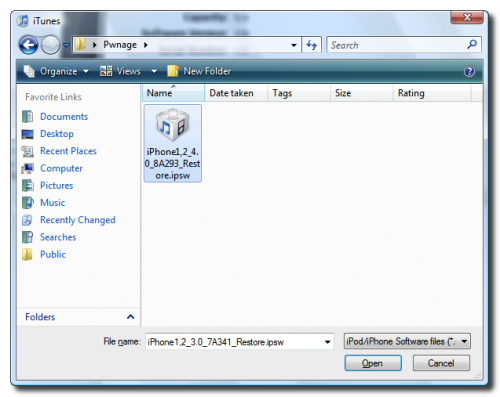 Válaszd ki a Pwnage könyvtárban lévő firmware .ipsw fájlt és nyomj rá az Open-re.