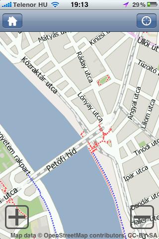 Indítás után megkérdezi, hogy használhatja-e a GPS-t, majd bejön egy Magyarország térkép, megjelölve a pozíciót. Érdekes módon nem kétujjas mozdulattal, hanem a + és – gombokkal lehet zoomolni. A bal felső sarokban lévő Home gomb visszavisz a kiinduló térképnagysághoz (egész Magyarország látszik), míg a jobb felső sarokban lévő gomb megnyomására a aktuális zoomot meghagyva a jelenlegi pozícióhoz lapoz.