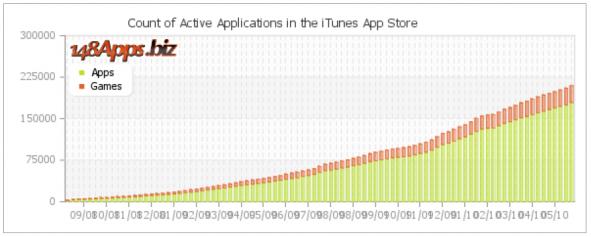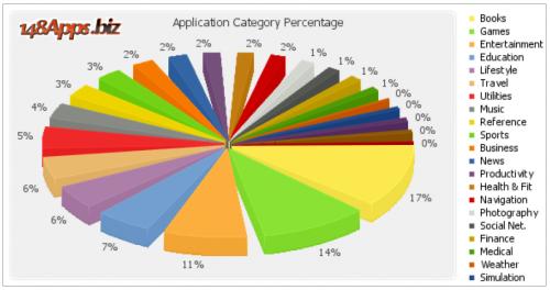 Az App Store-ban lévő alkalmazások szám átlépte a 250 ezret. Ezt a bűvös számot két év és 49 nap alatt érték el. Az induláskor talán senki sem bízott ekkora sikerben. Mint a lenti diagram is mutatja, legtöbb program a Könyvek kategóriában van (17 %), ezt követi a játék (14 %) és a Szórakozás (11 %). Felmérés szerint az alkalmazások 70 %-a fizetős, míg ez az Android boltjában csak 36 %. Persze azt senki sem tagadja, hogy ingyenes alkalmazásokat jóval többen töltenek le.