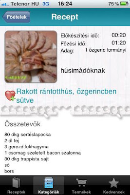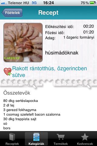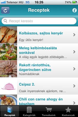 A program bőséges adatbázissal rendelkezik, kezdő szakácsoknak vagy ötlettelen háziasszonyoknak nagyszerű lehetőséget teremt a főzőcskézésre. Egyetlen hátránya, hogy 3GS-en eltelik 2-3 másodperc mire reagál a kattintásra (nem futott multitaskingben semmi).