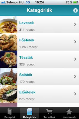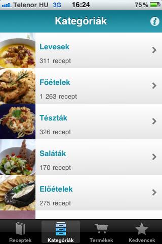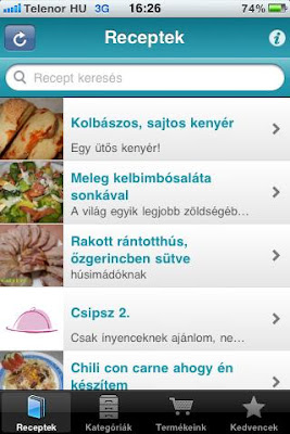 A program indítása után a Receptek fülön a legutóbb feltöltötteket láthatjuk. Már most el kell mondani, hogy az ételekhez nagyszerű képek tartoznak, az ember szájában összefut a nyál.