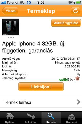 A találati listából válogathatunk melyik részleteire vagyunk kíváncsiak. Adott termékbe belépve elég sok lehetőségünk van. Licitálhatunk, elolvashatjuk a termék leírását, megnézhetjük az eladó értékelését, megoszthatjuk másokkal az aukciót twitteren, Facebookon és emailben és kérdezhetünk az eladótól is.