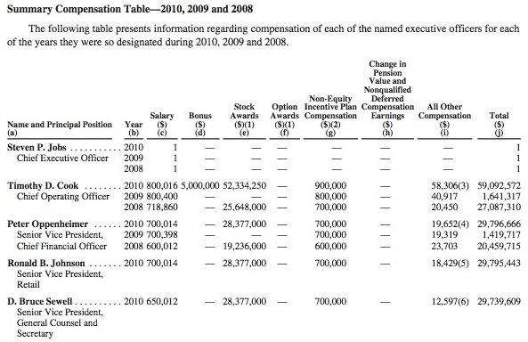 Az Apple nyilvánosságra hozta a vezetők éves keresetét. Listát Steve Jobs vezeti évi 1 dolláros fizetéssel. Persze nem fog éhen halni, cégbeli részesedése 1.8 milliárd dollárt ér. Jobs még felvett 248 ezer dollárt repülései költségére. A JobsMobile-t még a múlt században kapta, ez egy 90 millió dollár értékű Gulfstream V repülőgép.