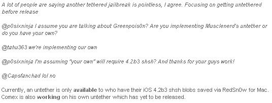 Chronic bejelentette, hogy olyan untethered jailbreaken dolgoznak, amelyik nem kéri a 4.2.1-es béta 3 rendszer SHSH információit. Az iPhone Dev Team már kifejlesztett egy 4.2.1-es untethered jailbreaket, de ahhoz kell a 4.2.1-es béta 3 rendszer SHSH információja, ami keveseknek van meg.