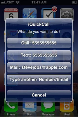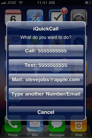 Az iQuickCall Cydiás alkalmazás az Activator által nyújtott lehetőségeket használja ki: program indítása a képernyő sarkának megérintésével, Home gomb hosszanti nyomása, stb. Beállított mozdulatra feljön egy ablak, amiben kiválasztható, hogy telefonálni, SMS-t vagy emailt akar valaki küldeni. Nagyon hasznos kis tweak, 0.99 dollárért vásárolható meg a Cydiából.