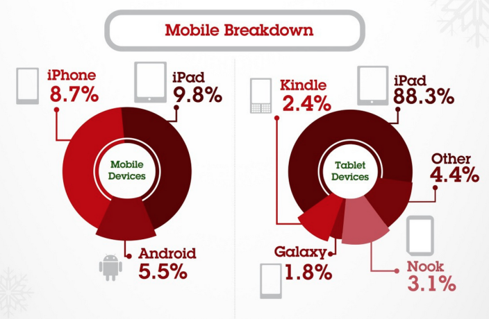 A webes forgalmat monitorozó IBM tracking szerint a tabletes netes forgalom 83,3%-a iPadről érkezett, az összes online rendelés 10%-ával is ez az eszköz büszkélkedhet, 8.7% jutott iPhone-ra, míg az androidos eszköz csak 5.5%-ot hasítottak ki a képzeletbeli tortából.