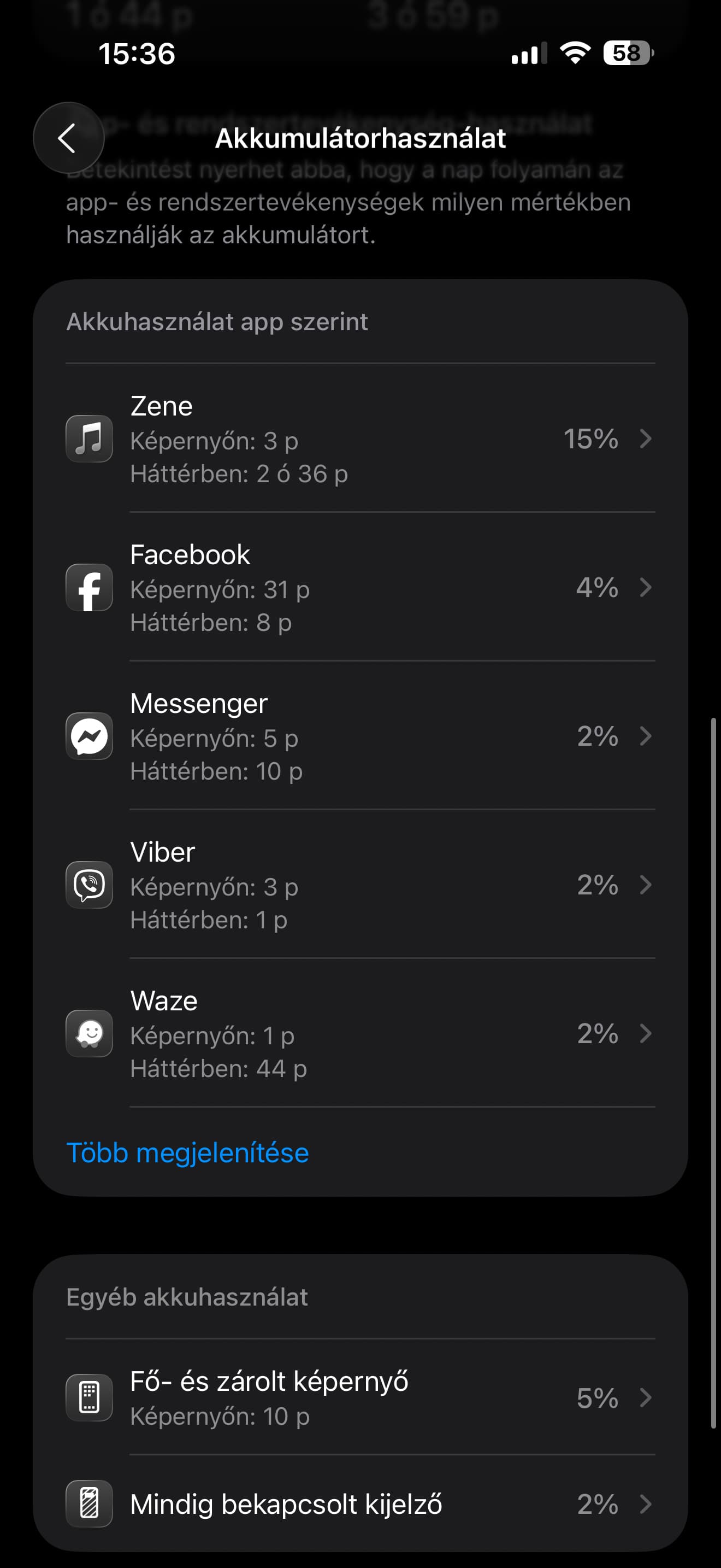 Persze a mostani képernyőkép ilyen használattal 58% ra merült 1óra 44 perc használattól 4 óra tétlen képernyőtől,persze ha használom valami hajtja is a procit mert melegszik nagyon. jelenleg ha pl 5 órát használom napi szinten akkor van,hogy 2x töltőm egy nap
