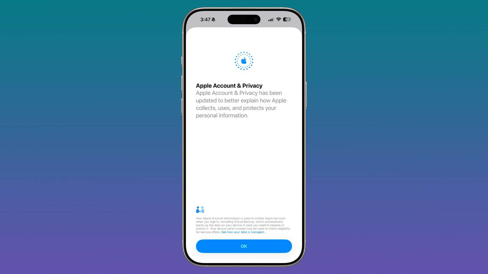 Az iOS 26.2 telepítése után amikor először megnyitod az iCloud fiókod a Beállítások alkalmazásban, egy alulról beúszó panelen tájékoztat majd az Apple az adatkezelési szabályzatuk módosításairól.