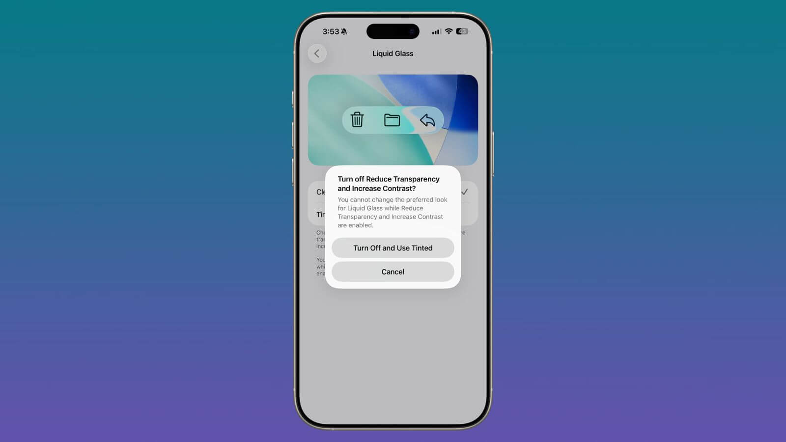 A jelenlegi szöveg nehezen észrevehető és még félbe is szakad, ezért az Apple az iOS 26.2-től egy felugró modális ablakkal hívja fel a figyelmet rá, hogy ha a Színezett opciót választod, akkor kikapcsolásra kerül az Átlátszóság csökkentése és a Kontraszt növelése.