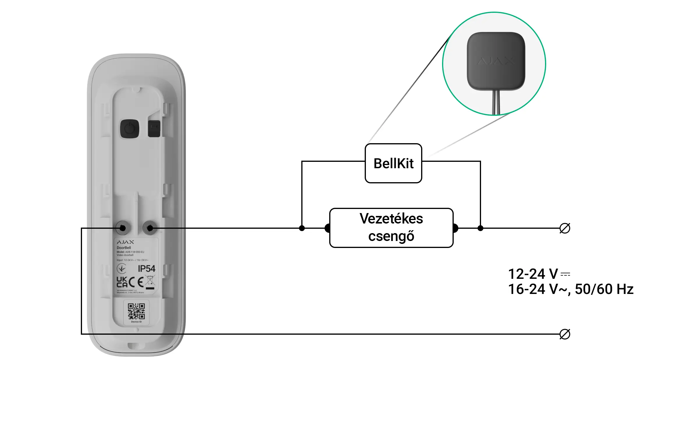 Arra is van lehetőségünk, hogy a DoorBell a meglévő elektromechanikus csengőnket is meg tudja csöngetni. Ehhez a csengő típusától függően az Ajax DoorBellhez tartozékként járó BellKitet is be kell kötnünk az alábbi ábrának megfelelően: