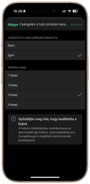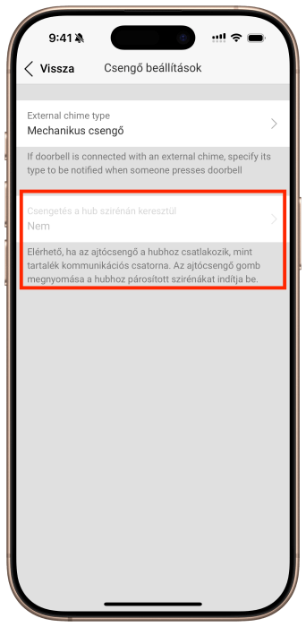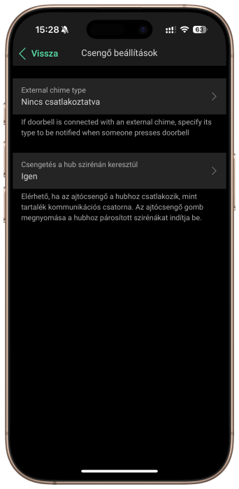 A szirénát a DoorBell beállításaiban a Csengő beállítások opciója alatt tudjuk kiválasztani, ha a kapucsengő a hubhoz csatlakozik tartalék kommunikációs csatornaként, és van Ajax sziréna is a rendszerünkben. Ha nincs sziréna az Ajax rendszerünkben, akkor ez az opció értelemszerűen nem érhető el, és ki is van ilyenkor szürkülve: