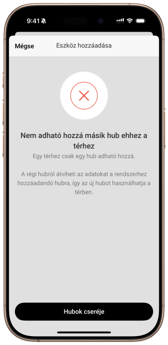 Egy térhez csak egy hub adható hozzá, így az új hub hozzáadásakor az app figyelmeztet minket erre, és felajánlja az opciót a hubok cseréjére: