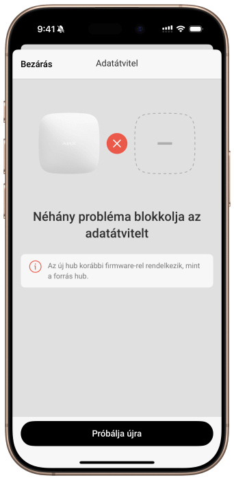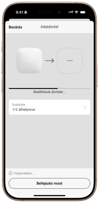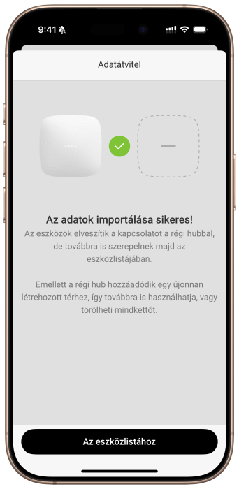 Itt még fontos kiemelni, hogy a távfelügyeleti cég és a távfelügyeleti beállítások nem kerülnek automatikusan átvitelre, amire az app is figyelmeztet minket, és megemlíti, hogy ne kezdjük el az adatok átvitelét egy másik hubra anélkül, hogy azt a biztonsági céggel egyeztetnénk.