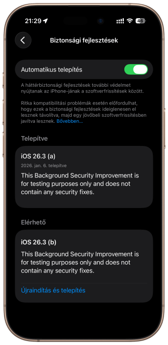 Az iPad esetén a Beállítások appban az Adatvédelem és biztonság ⇾ Háttérbiztonsági fejlesztések menüpont alatt telepíthetjük ezt – a jelenleg csak teszt – frissítést. Ennél ugyanúgy újraindul majd a készülék, mint egy “rendes” szoftverfrissítésnél.