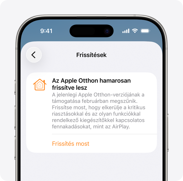 Ha tagjai vagyunk egy otthonnak az Otthon appban, amelyhez legalább egy okosotthon-kiegészítő tartozik, például HomePod, Apple TV vagy okosizzó, akkor a rendszer felszólít minket, hogy frissítsünk, ha esetleg még nem az Apple Otthon legújabb verzióját használjuk. A frissítésre vonatkozó információk megjelennek az Otthon appban vagy a Beállítások appban, illetve az Apple e-mailben is küldött erről tájékoztatást.
